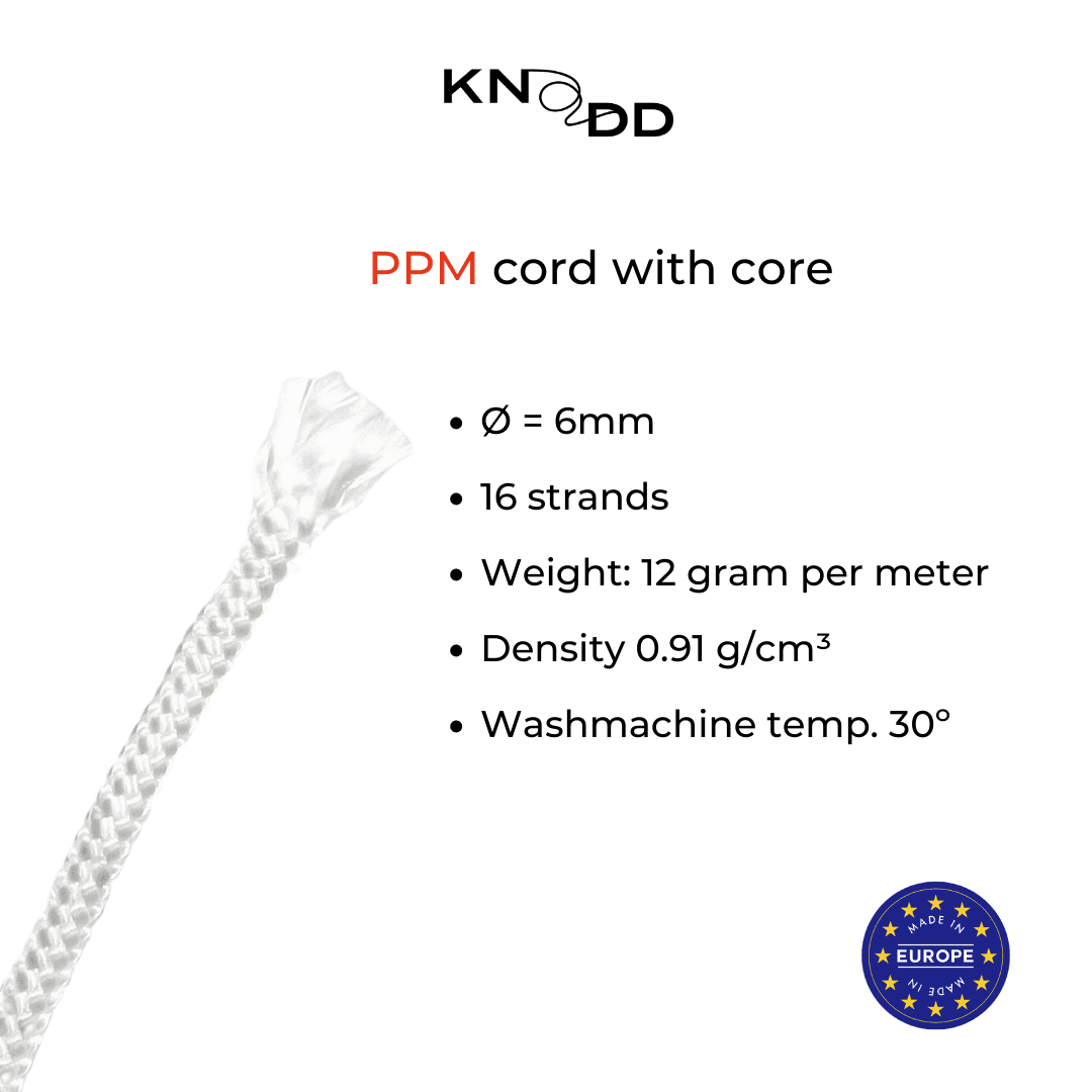 PPM rope can be washed in a washing machine at max 30 degrees. Ropes made of PPM are highly valued thanks to their low weight, weather resistance, excellent knotability and universal range of applications. The 6 mm PPM Rope Sleeve is 12-stands. Contains 1 core thread and is has a Polypropylene Multifilament Fiber type. Made in EU.